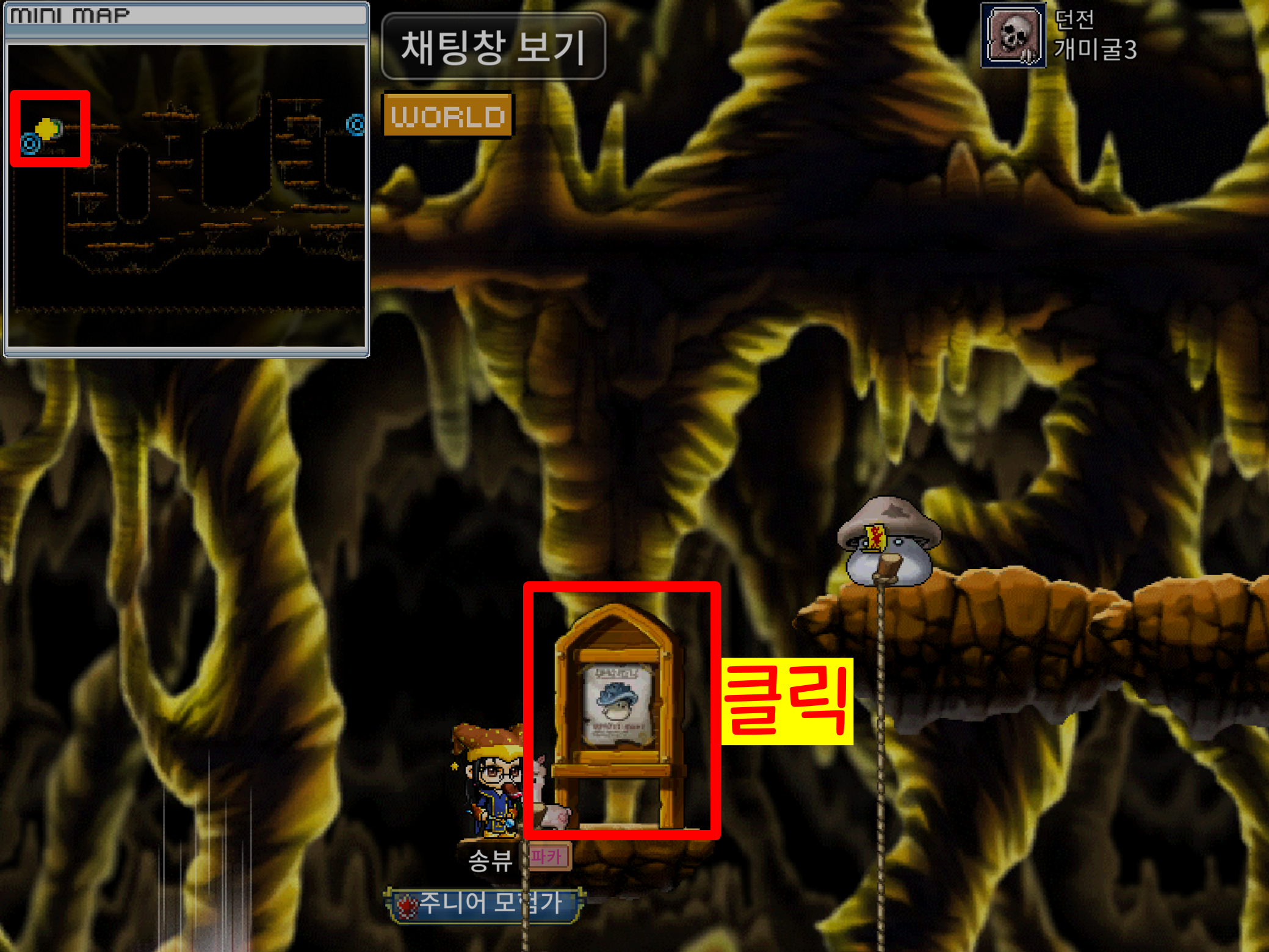 Tip : 개미굴에는 위험한 던전 : 뿔버섯, 좀비버섯 퀘스트를 진행할 수 있는 NPC 있습니다.