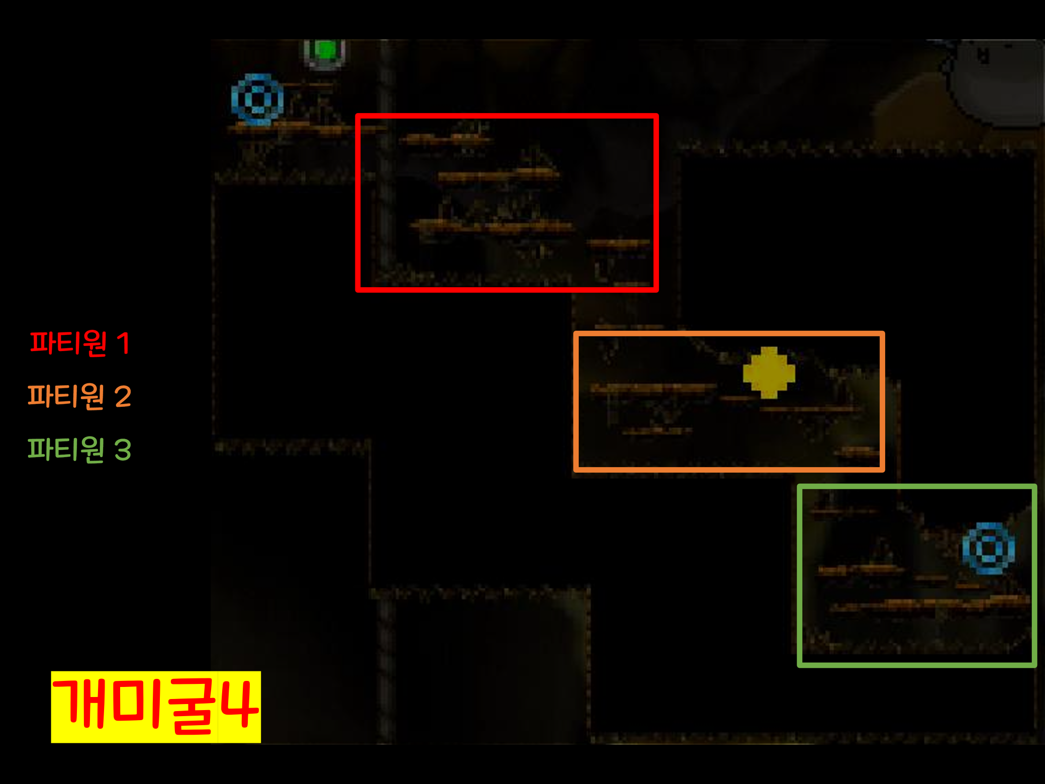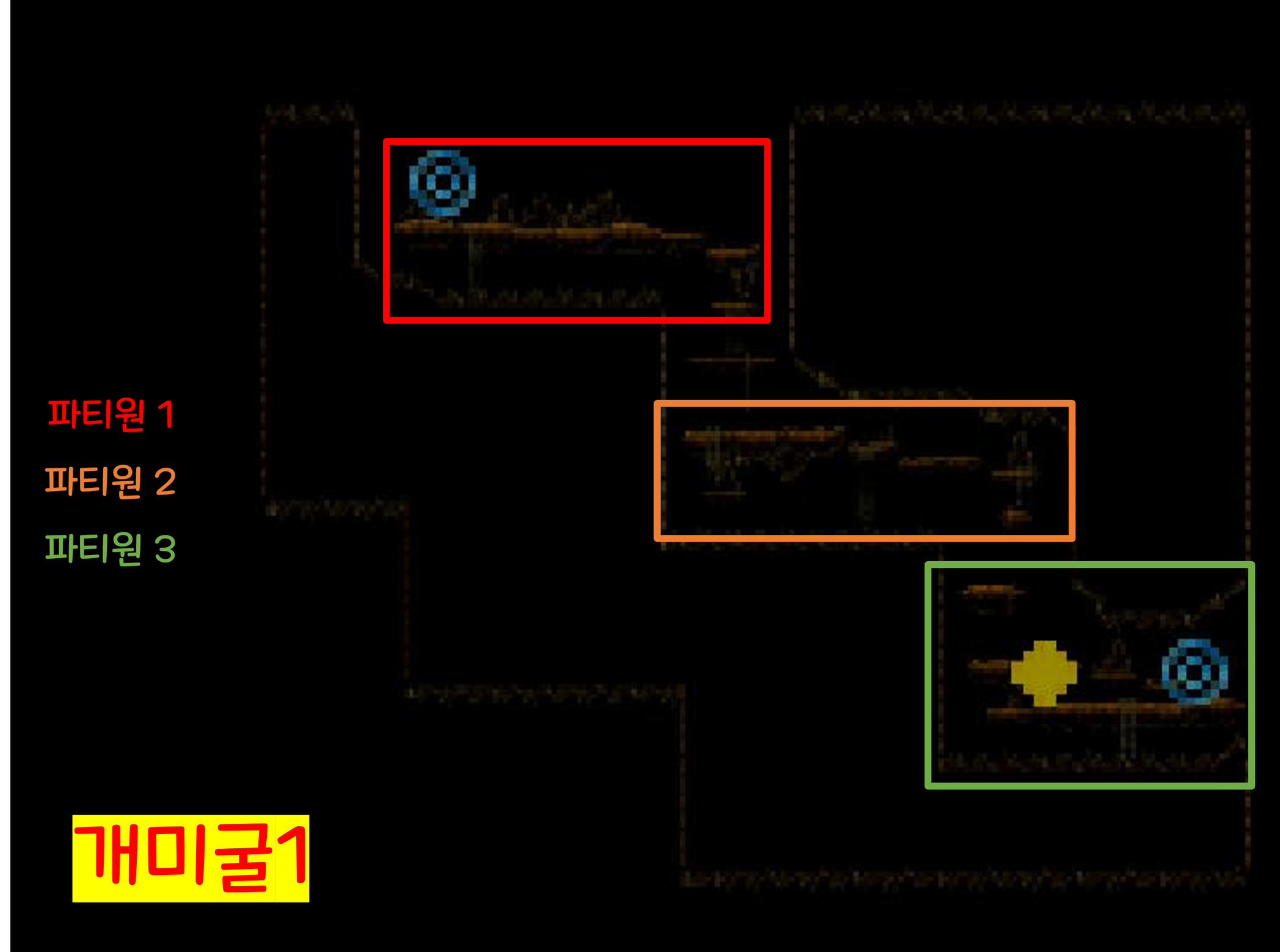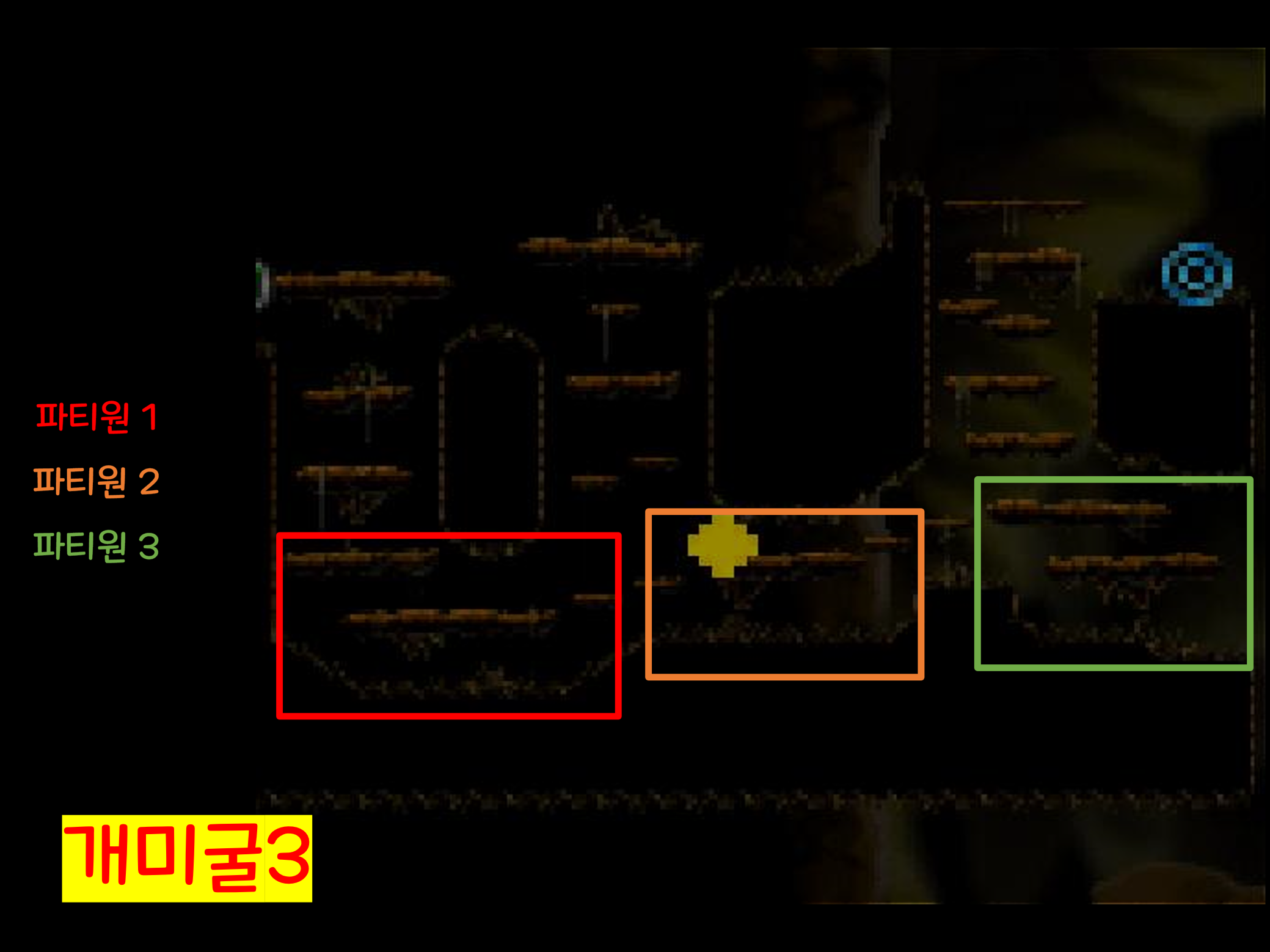 (파티원 3명 기준 위처럼 구역을 나누어서 몬스터를 잡아주시는 것을 추천드립니다.)