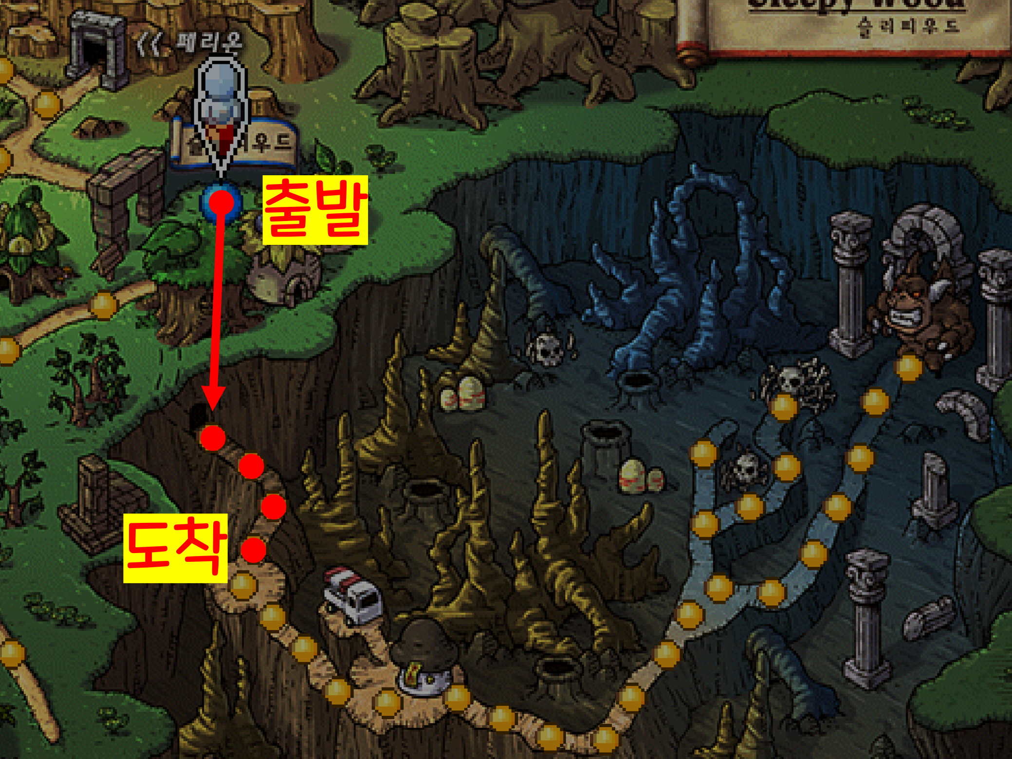 개미굴은 1~4까지 총 4군데로 구성되어 있습니다. 일단 슬리피우드 마을로 이동해 줍니다.