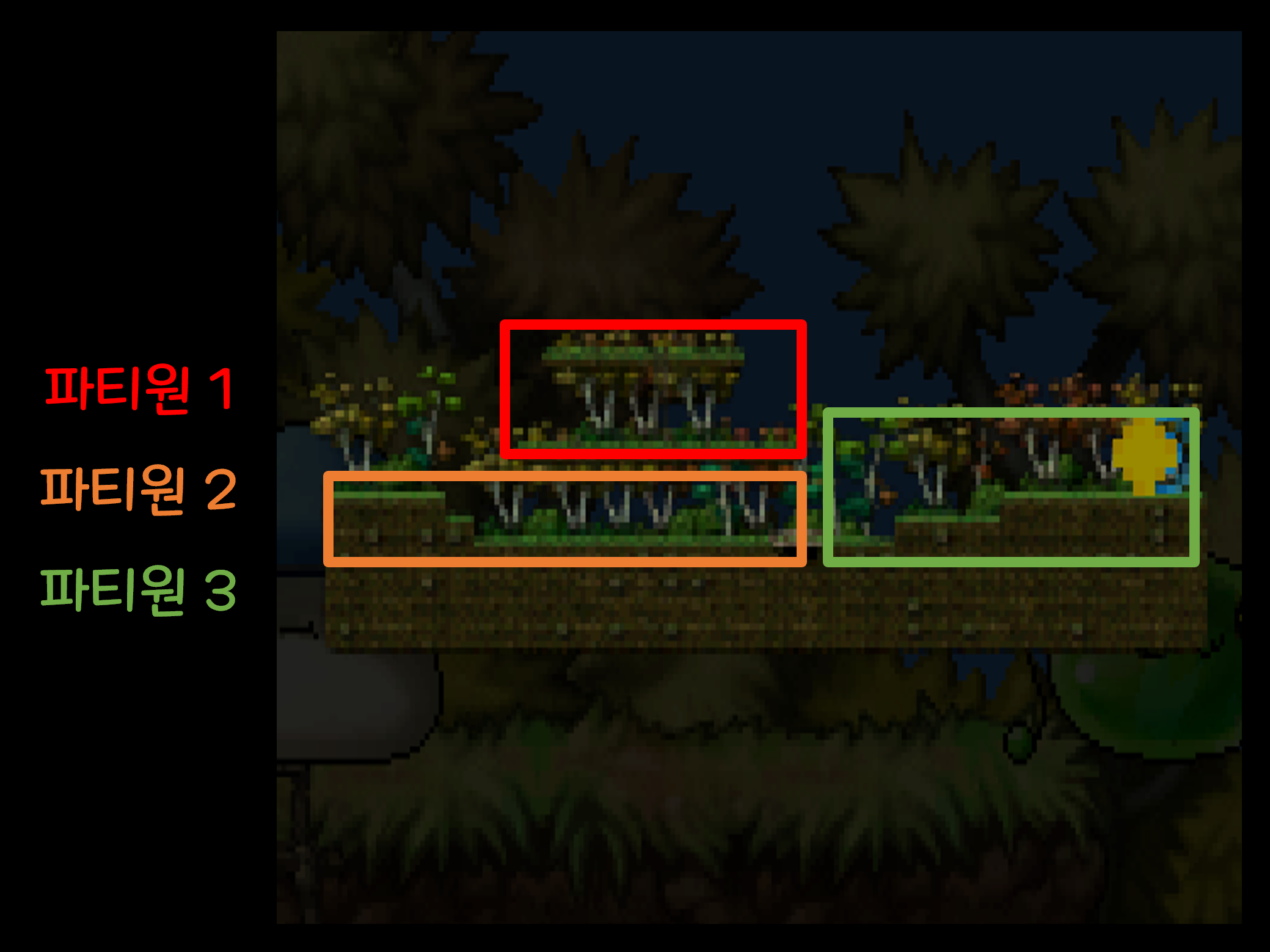 파티원1 구역이 가장 좁으므로 근거리 직업군은 파티원1 구역에서 잡아주시는게 수월하실 것 같습니다.