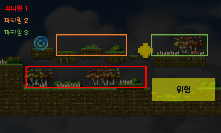 제 개인적인 경험으로는 파티원 3의 구역이 가장 좁기 때문에 근거리 직업(전사, 단검 도적, 너클 해적)에게 추천드립니다